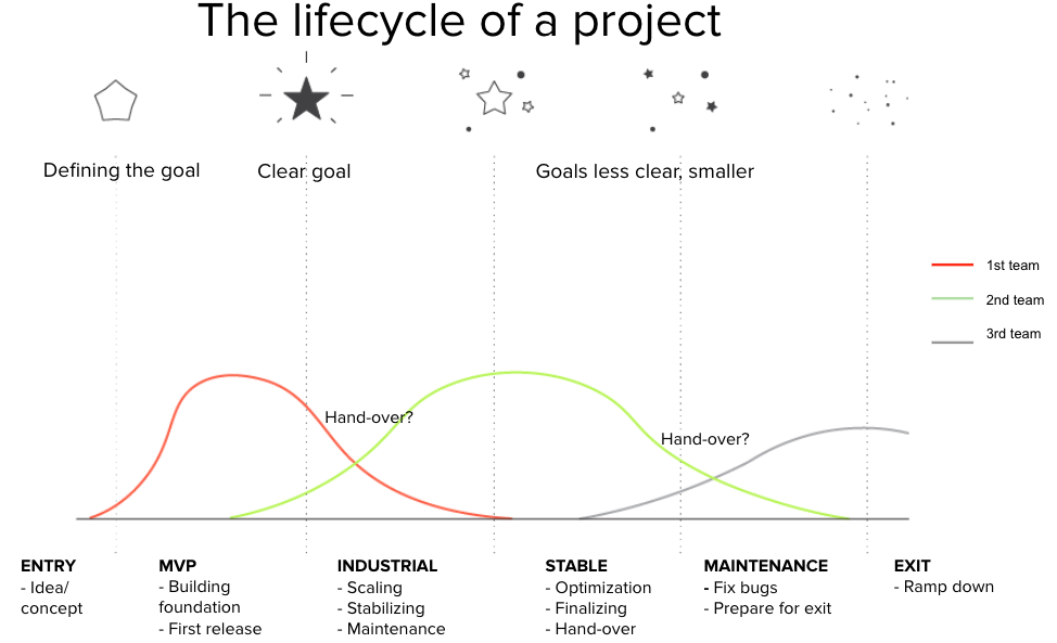 The curves in the diagram describe different teams in the same project. At least in our case, there were couple of key points in the lifecycle that co-incided with lot of changes to the project personnel. First one was when moving from MVP to industrial phase, and another one when shifting from stable to maintenance phase.